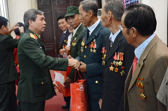 Thừa ủy quyền của Thủ trưởng Bộ Quốc phòng, Trung tướng Đỗ Căn đã trao quà của Bộ Quốc phòng tặng các đại biểu NCC với cách mạng của tỉnh Quảng Trị.