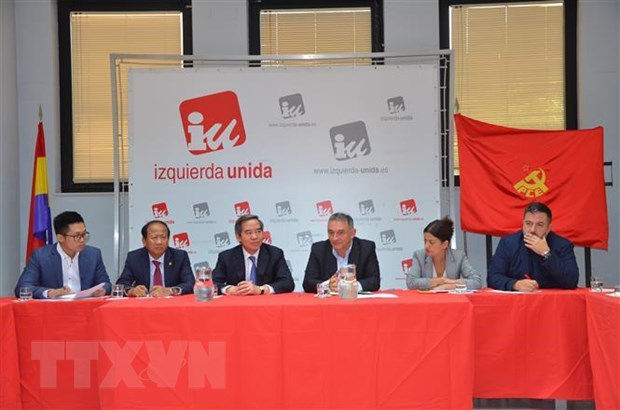 Đoàn đại biểu Đảng Cộng sản Việt Nam làm việc với đại diện Liên minh cánh tả thống nhất Tây Ban Nha. (Ảnh: Toàn Trí/TTXVN)