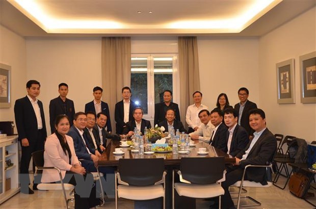 | Đoàn đại biểu Đảng Cộng sản Việt Nam với cán bộ, nhân viên Đại sứ quán Việt Nam tại Tây Ban Nha. (Ảnh: Toàn Trí/TTXVN) |
