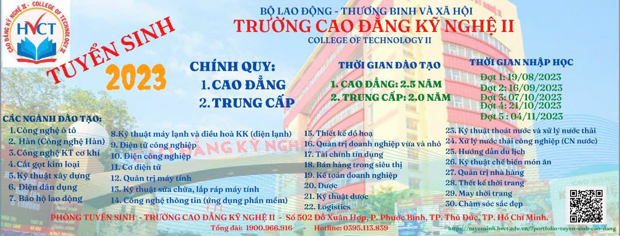 Trường Cao đẳng Kỹ nghệ II - là đơn vị Công lập thuộc Bộ Lao động - Thương binh và Xã hội, được thành lập từ năm 1978. Năm 2023, Trường tiếp tục tuyển sinh hệ Cao đẳng - Trung cấp với các ngành đào tạo như sau: