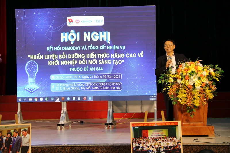 Phát biểu tại hội nghị tổng kết, NGƯT. TS Phạm Xuân Khánh – Chủ tịch Hội đồng trường chia sẻ: "Để tiếp bước các hoạt động của nhiệm vụ, hôm nay, trường Cao đẳng nghề Công nghệ cao Hà Nội phối hợp với Đoàn Thanh niên – Bộ KH&CN long trọng tổ chức “Hội nghị kết nối Demoday và Tổng kết nhiệm vụ Huấn luyện bồi dưỡng kiến thức nâng cao về khởi nghiệp đổi mới sáng tạo” với mục đích trình diễn sản phẩm của các nhóm khởi nghiệp, tổng kết nhiệm vụ và điều chỉnh khung chương trình đào tạo kiến thức khởi nghiệp ĐMST.