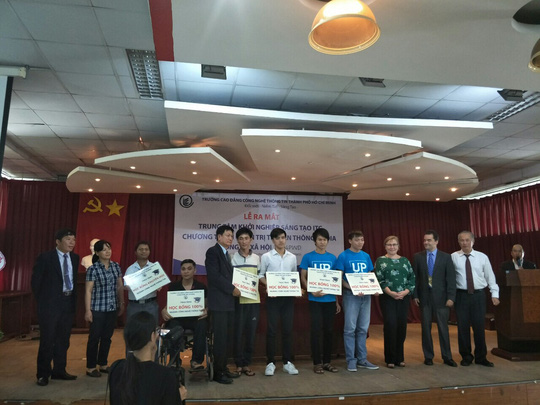 Ban giám hiệu Trường CĐ Công nghệ Thông tin TP HCM trao học bổng cho 5 sinh viên khuyết tật