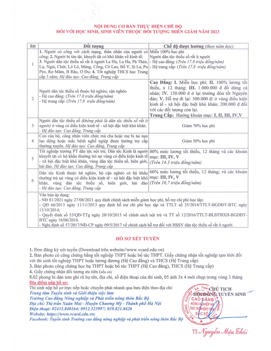 Trường Cao đẳng Nông nghiệp và Phát triển nông thôn Bắc Bộ (VCARD) được thành lập ngày 16/01/1961, là trường Cao đẳng công lập thuộc hệ thống giáo dục quốc dân, trọng điểm của Bộ Nông nghiệp và Phát triển nông thôn. Năm 2023, Trường tiếp tục tuyển sinh hệ Cao đẳng - Trung cấp với phương thức tuyển sinh và hình thức tuyển sinh như sau: