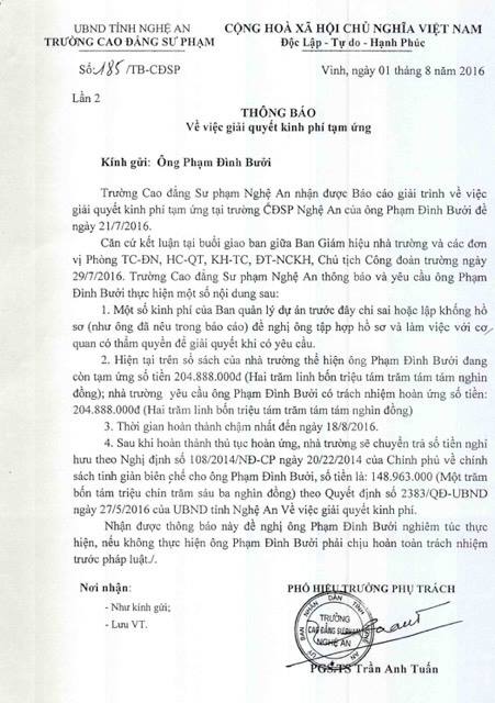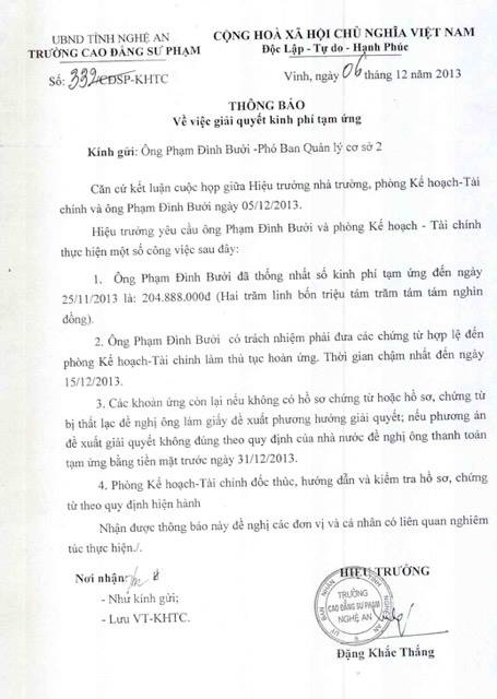 Theo các văn bản do Hiệu trưởng Trường CĐSP Nghệ An gửi cho “con nợ” này, tính đến ngày 25/11/2013 số tiền ông Phạm Đình Bưởi tạm ứng của nhà trường là 204.888.000 đồng. Ngày 06/3/2013, ông Đặng Khắc Thắng- Hiệu trưởng Trường CĐSP Nghệ An đã có văn bản thông báo (số 332/CĐSP-KHTC gửi đích thân ông Bưởi, đôn đốc việc hoàn ứng số tiền trên. Hạn cuối cùng mà ông Thắng yêu cầu ông Bưởi phải hoàn thành nghĩa vụ hoàn ứng là 31/12/2013. Thế nhưng, cho đến nay, số tiền tạm ứng trên của ông Bưởi vẫn chưa được thu hồi.