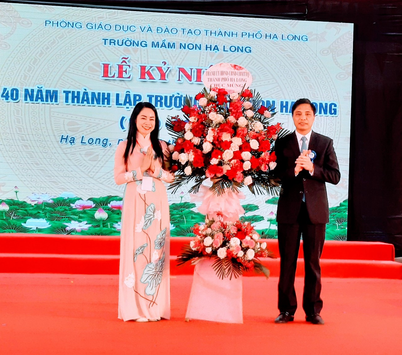 Đồng chí Bí thư thành ủy Hạ Long Vũ Văn Diện tặng hoa chúc mừng nhà trường