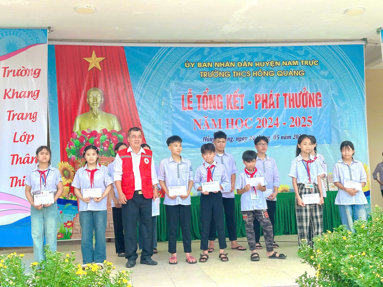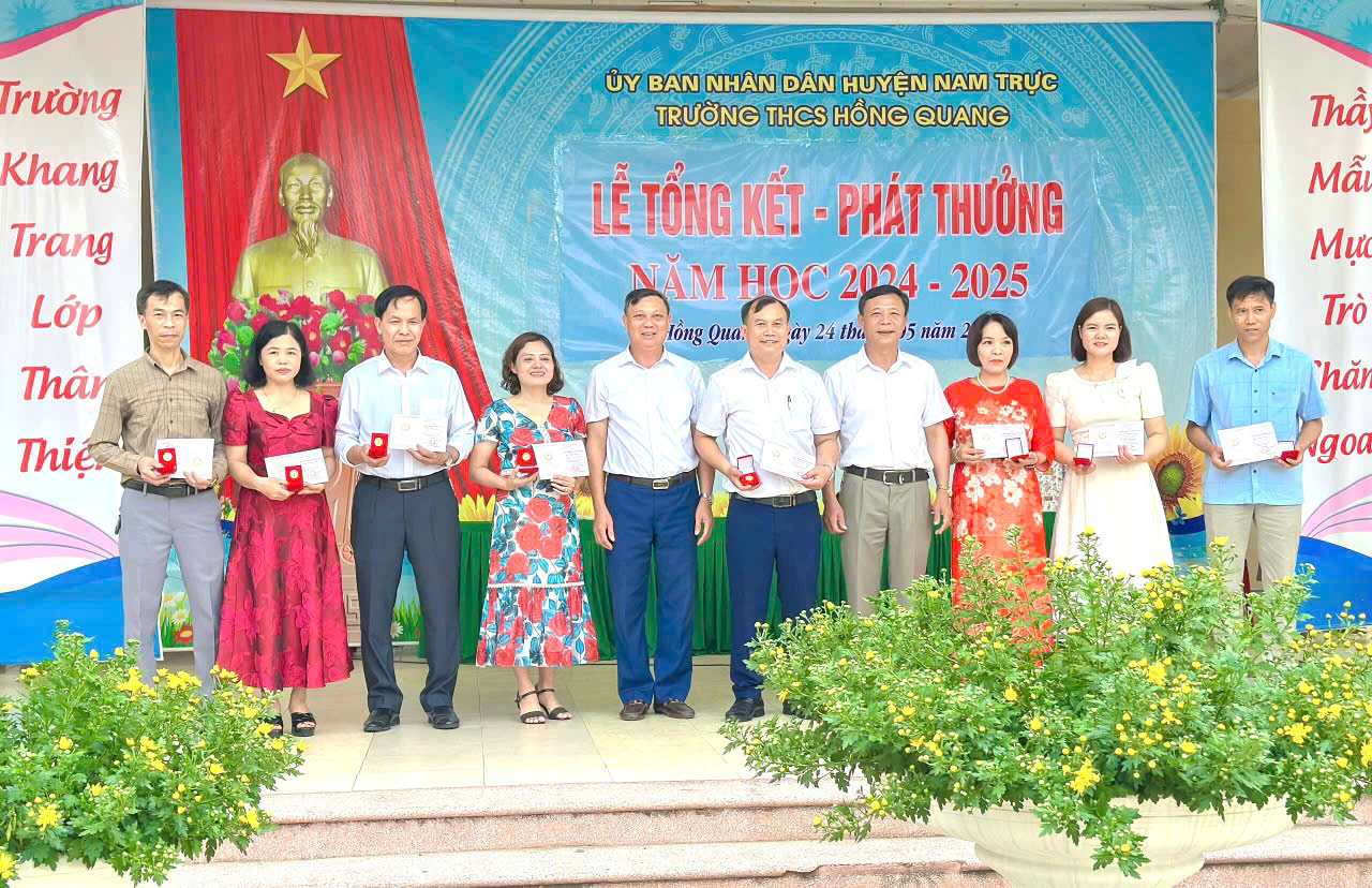 Tại lễ Tổng kết - Phát thưởng năm học 2024-2025, Hội đồng thi đua khen thưởng Trường THCS Hồng Quang đã trao giấy khen, phần thưởng cho những học sinh đạt giải tại kỳ thi học sinh giỏi các môn văn hóa, thi đấu TDTT cấp tỉnh, cấp huyện và đạt danh hiệu học sinh giỏi năm học 2024-2025. Hội Khuyến học huyện Nam Trực cũng đã trao tặng 13 suất quà, mỗi suất 300.000 đồng cho 13 học sinh thuộc diện khuyết tật, con hộ nghèo, cận nghèo; trao 4 suất học bổng “Học không bao giờ cùng” cho 4 học sinh vượt khó học giỏi, mỗi suất 1 triệu đồng. Thầy giáo Nguyễn Duy Phú, Hiệu trưởng nhà trường cùng bà Phan Thị Xuân, Chi hội trưởng lớp 7D đã trao thưởng cho 12 học sinh đạt thành tích cao tại kỳ thi HSG cấp huyện, cấp tỉnh và trao 33 suất quà trị giá 7 triệu đồng cho 21 học sinh vượt khó học khá, giỏi.