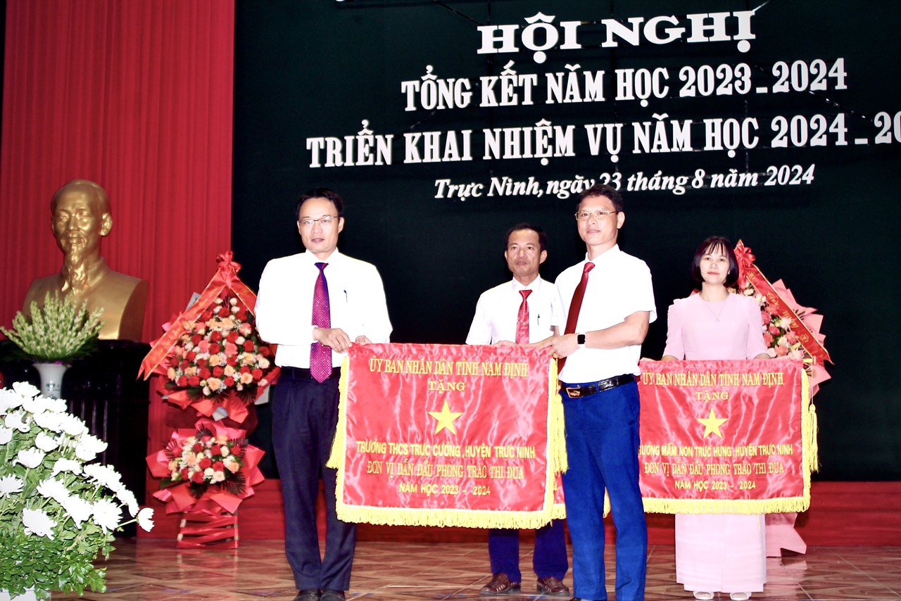 Lãnh đạo huyện Trực Ninh trao Cờ “Đơn vị dẫn đầu phong trào thi đua” (lần thứ hai liên tiếp) của UBND tỉnh Nam Định cho Trường THCS Trực Cường tại hội nghị tổng kết năm học 2023-2024, triển khai nhiệm vụ năm học 2024-2025 - Ảnh: Hồ Thanh