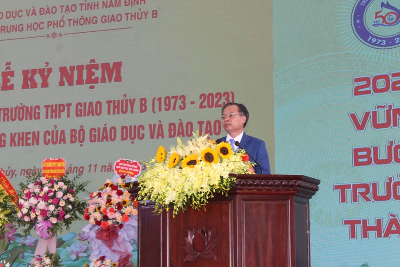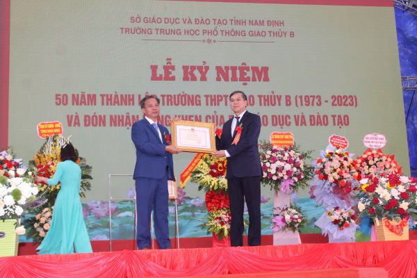 Phát biểu tại buổi lễ, Phó Chủ tịch UBND tỉnh Nam Định Trần Lê Đoài đã ghi nhận, biểu dương, chúc mừng những thành tích của nhà trường trong 50 năm qua, trao Bằng khen của Bộ GD&ĐT cho Trường THPT Giao Thủy B và trao tặng Bằng khen của UBND tỉnh Nam Định cho tập thể, cá nhân có thành tích xuất sắc. Phó Chủ tịch HĐND tỉnh Nam Định Mai Thanh Long và Phó Chủ tịch UBND tỉnh Nam Định Trần Lê Đoài cũng đã thay mặt lãnh đạo Tỉnh ủy, HĐND, UBND tỉnh Nam Định trao tặng nhà trường lẵng hoa tươi thắm.