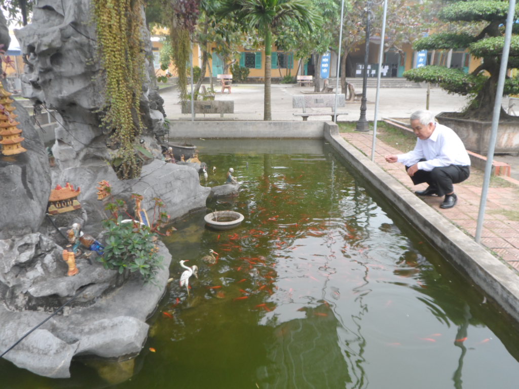 | Phút thư giãn của thầy giáo Đoàn Văn Thoại, Hiệu trưởng Trường THPT Quang Trung bên hòn non bộ nuôi cá vàng trong khuôn viên nhà trường |