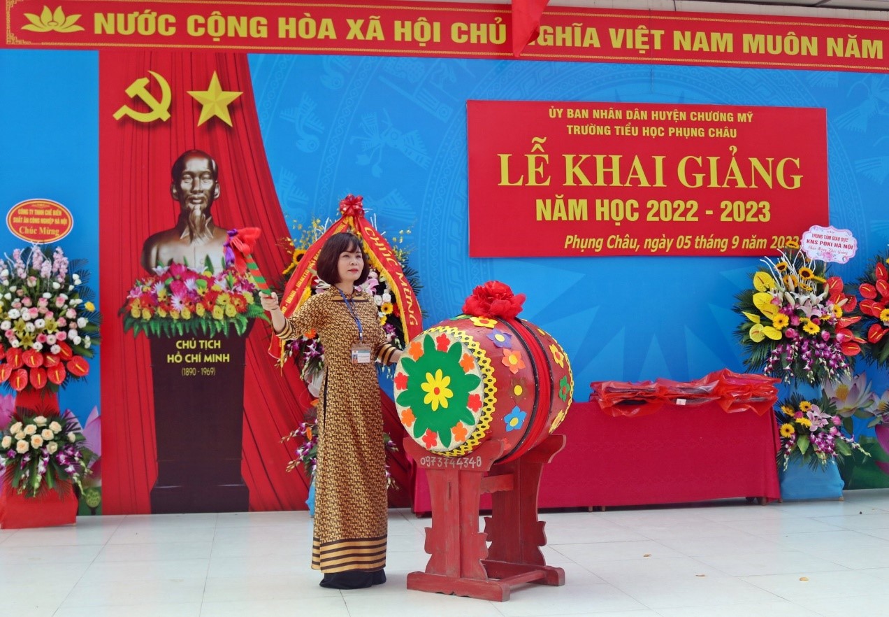Bà Nguyễn Thị Bích Hằng - Hiệu trưởng Trường Tiểu học Phụng Châu đánh trống khai giảng năm học mới.