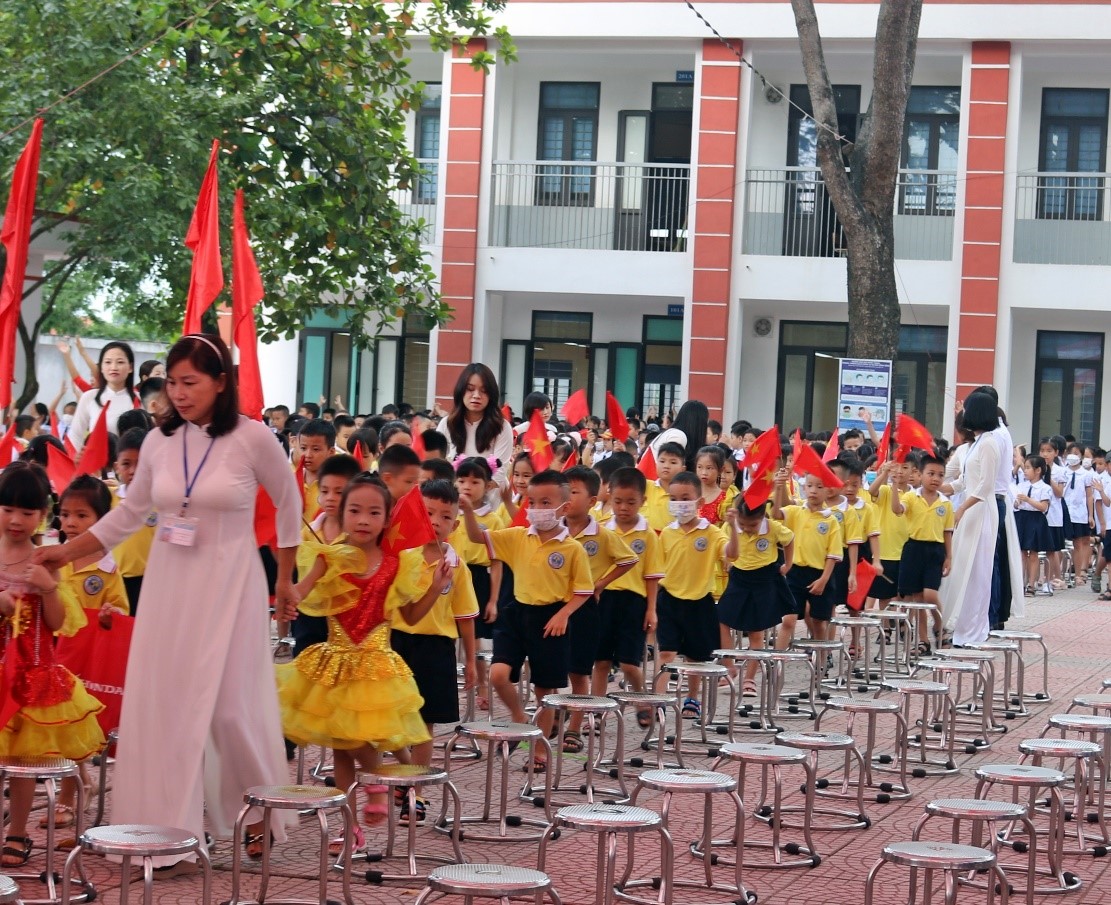 Trường Tiểu học Phụng Châu học sinh bắt đầu đông dần từ gần 7h, các giáo viên có mặt từ tờ mờ sáng để chuẩn bị. Cô Hà giáo viên chủ nhiệm lớp 1 trong năm mới dậy từ 4h sáng “Sau thời gian dài bị ảnh hưởng nặng nề bởi Covid - 19, năm nay trường Phụng Châu mới tổ chức buổi lễ khai giảng trọn vẹn, long trọng tại sân trường. Hơn chục ngày nay, cả trường háo hức chuẩn bị cho ngày quan trọng này.