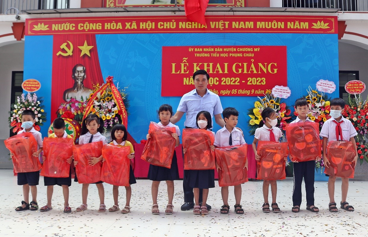 Đại diện lãnh đạo UBND huyện Chương Mỹ trao quà cho các em học sinh.