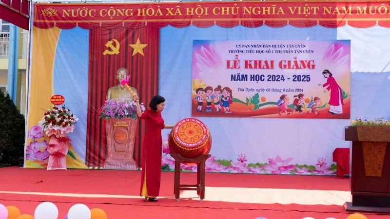 Sau bài phát biểu, cô Phan Thị Nga - Hiệu trưởng nhà trường đã gióng lên những tiếng trống rộn ràng báo hiệu một năm học mới bắt đầu. Tiếng trống rộn vang, bay xa như mang theo những hi vọng một năm học mới thành công rực rỡ với thật nhiều thành tích của cả thầy và trò trường Tiểu học số 1 thị trấn Tân Uyên.