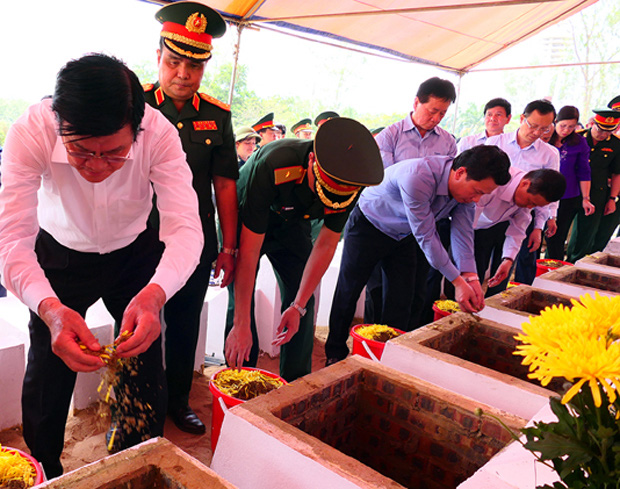 Nguyên Chủ tịch nước Trương Tấn Sang và Bí thư Tỉnh ủy Đặng Quốc Khánh cùng các đại biểu tiễn đưa hài cốt Liệt sỹ về yên nghỉ tại Nghĩa trang Liệt sỹ Quốc gia Vị Xuyên.