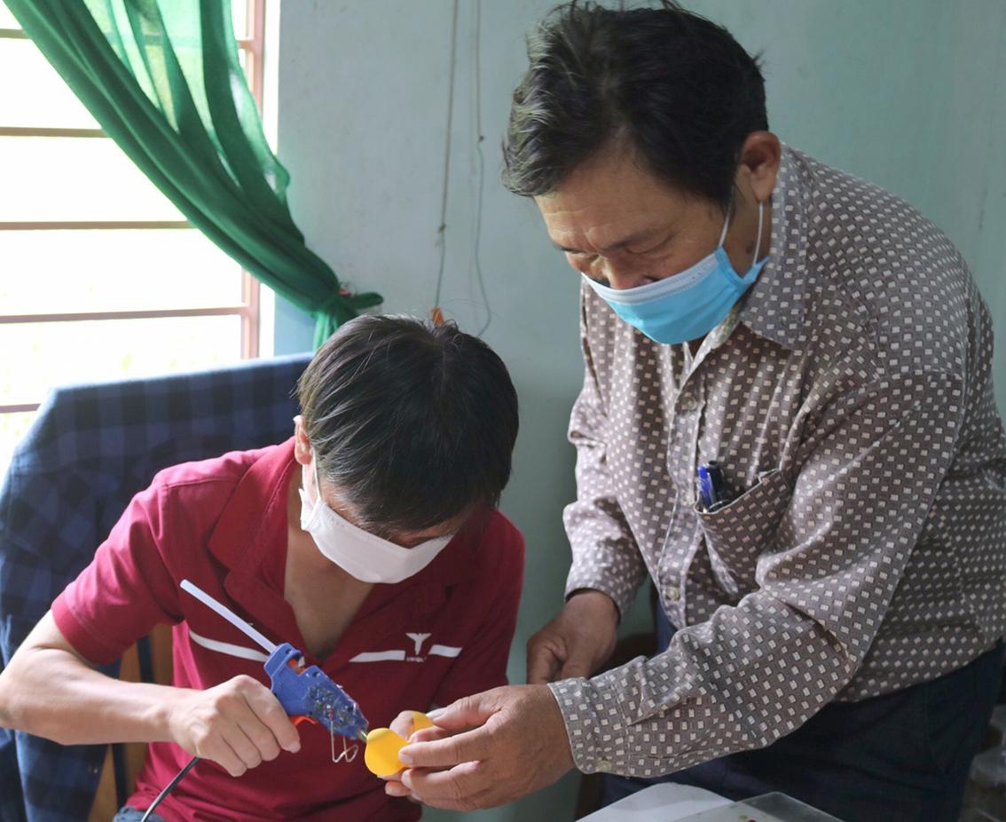 Trịnh Văn Hải (18 tuổi, ở xã Bình Sa, H.Thăng Bình) mắc bệnh hở van tim, sức khỏe yếu, phải nghỉ học từ năm 15 tuổi. Sau thời gian ở nhà, Hải được “thầy Bích” vận động và tham gia Hội người khuyết tật. “Em vào lớp học nghề này được 3 tháng, được thầy Bích chỉ dạy cách làm hoa giấy và các sản phẩm thủ công. Ở đây em rất vui, nhiều anh chị giờ đã trở thành bạn bè. Thầy Bích luôn tận tình chỉ dạy nên hiện nay em đã có được một nghề, mong rằng sau này có thể giúp đỡ một phần cho gia đình từ nghề mới này”, Hải nói.