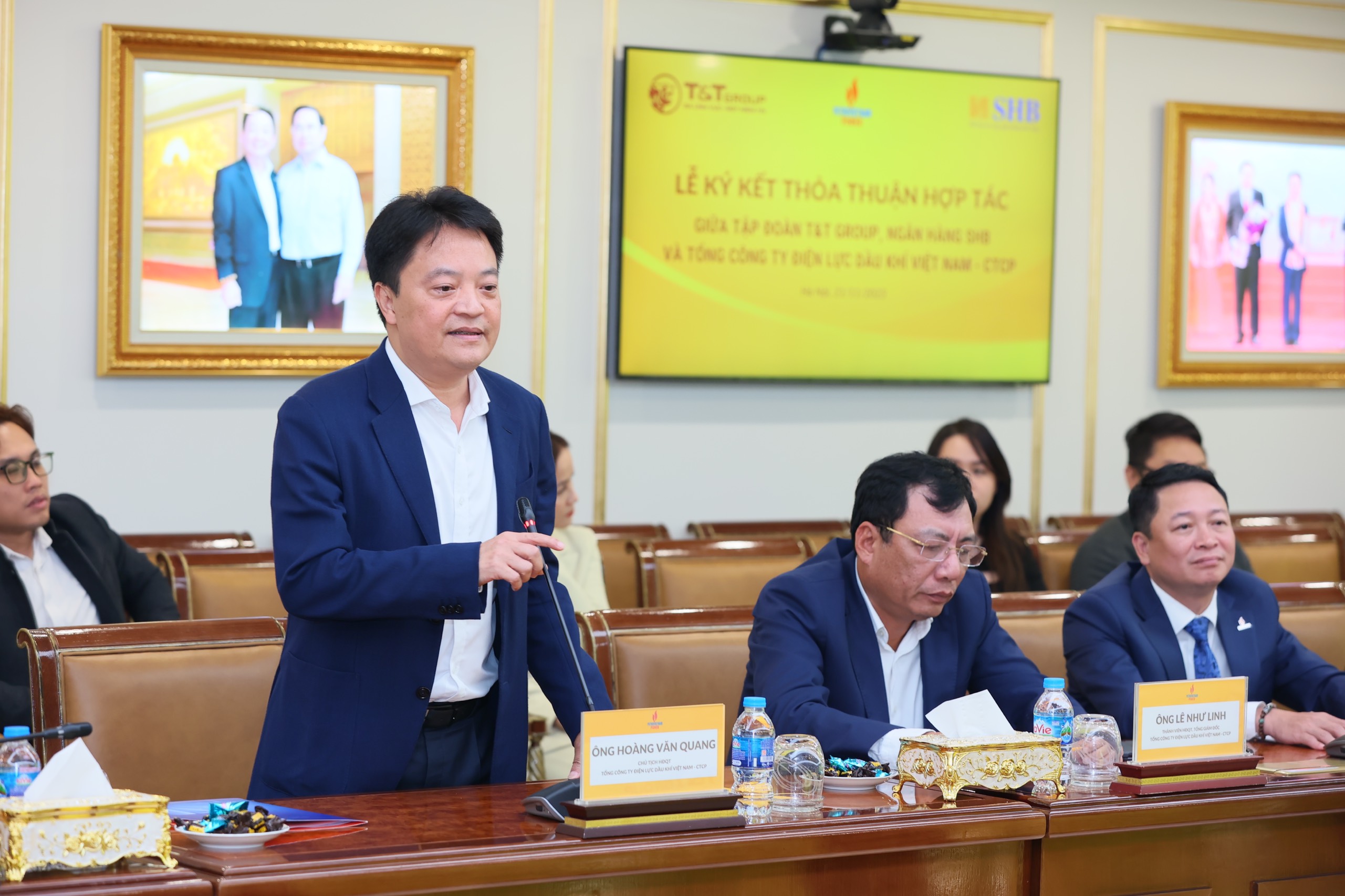 Ông Hoàng Văn Quang, Chủ tịch HĐQT PV Power đánh giá cao tiềm lực hợp tác đầu tư của các bên trong thỏa thuận hợp tác lần này. Ông tin tưởng rằng, với thế mạnh của Tập đoàn T&T trong đầu tư phát triển các dự án điện - đặc biệt là năng lượng xanh, năng lượng tái tạo, kết hợp với SHB - một trong những ngân hàng thương mại hàng đầu của Việt Nam, ba Bên khai thác tốt nhất thế mạnh của mỗi đơn vị nhằm mở rộng và phát triển hoạt động kinh doanh, trở thành đối tác chiến lược của nhau trong thời gian tới.