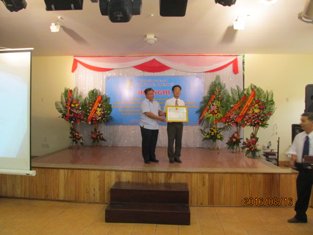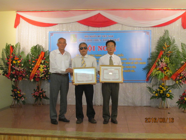 | Thiếu tướng Trần Vinh Quang - Chủ tịch Hội Doanh nghiệp của Thương binh và NKT Việt Nam tặng bàng khen cho tập thể trung tâm dạy nghề - tạo việc làm cho người mù và cá nhân đồng chí Lê Văn Lộc - Giám đốc trung tâm dạy nghề và tạo việc làm cho người mù tỉnh TT Huế. |