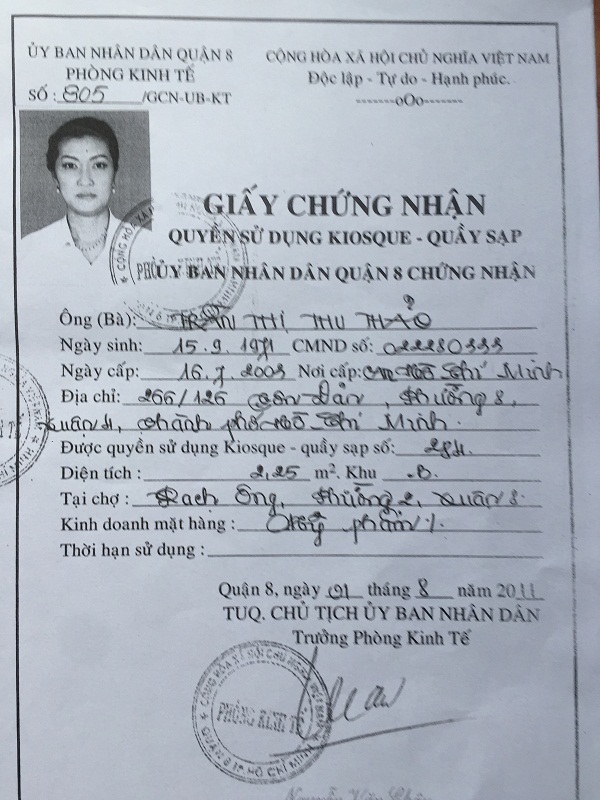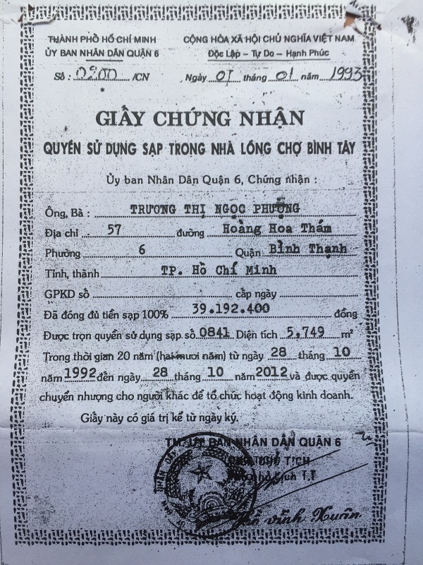 | Giấy chứng nhận quyền sử dụng sạp trong nhà lồng chợ Bình Tây, quận 6. |