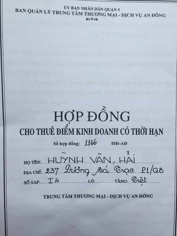 Tại Hợp đồng số 1166/HĐ-AĐ ngày 11/3/2013, Bên cho thuê (Bên A): Ban quản lý TTTMDV An Đông, ký Hợp đồng cho thuê điểm kinh doanh có thời hạn với ông Huỳnh Văn Hải (Bên B), thuê điểm kinh doanh có thời hạn tại Trung tâm TMDV An Đông, số 34-36 An Dương Vương, phường 9, quận 5, TP.HCM, sạp I-4, tầng trệt, vị trí sạp 1 mặt tiền, diện tích 2,1 m2. Thời hạn thuê là 10 năm, kể từ ngày 1/1/2012 đến hết ngày 31/12/2021. Trong đó, Điều 3 quy định giá thuê giai đoạn 1: 5 năm đầu giá thuê do 2 bên thỏa thuận; giai đoạn 2 giá thuê được tính theo tình hình thực tế trên cơ sở thỏa thuận giữa 2 bên. Nếu thanh toán 1 lần tiền thuê (5 năm ) được giảm 10%, số tiền thực nộp là 71.918.280 đồng. Đối với sạp 2 mặt tiền, diện tích 2,1m2, thì số tiền phải đóng giai đoạn 1 là 164.384.640 đồng. Các tiểu thương rất bức xúc cho biết, đây là bản hợp đồng có những điều khoản rất vô lý, trước đây Hợp đồng cho sang nhượng quầy, sạp chợ An Đông ký với Công ty tư doanh Việt Hoa, thời hạn là 20 năm nhưng trong Bản hợp đồng với Ban quản lý TTTMDV An Đông thì thời gian chỉ còn ...10 năm. Đáng chú ý, là hợp đồng ký ngày 11/3/2013 nhưng thời gian thuê lại được tính kể từ ngày 1/1/2012 đến 31/12/2021. Các tiểu thương cho rằng, vào thời điểm năm 1991, tiểu thương góp vốn xây chợ An Đông, số tiền 22.000.000 đồng, tương đương 4 lượng vàng cho diện tích quầy, sạp 1,5m x 1,5m, là quá cao so sới mặt bằng các chợ trong thành phố nên bà con tiểu thương không đồng ý, đã kiến nghị với lãnh đạo quận 5, phải xem xét lại số tiền đóng cho Công ty tư doanh Việt Hoa một cách hợp lý. Lúc đó, lãnh đạo Quận ủy, UBND quân 5, đã vận động bà con tiểu thương cố gắng đóng tiền xây chợ, sau khi hết hạn hợp đồng 20 năm, thì quận 5 chỉ thu tiền hoa chi thôi, không thu tiền thuê quầy, sạp nữa. Thế nhưng, trong Bản hợp đồng này, Ban quản lý TTTMDV An Đông lại thu tiền thuê điểm kinh doanh có thời hạn của tiểu thương với số tiền rất cao, là trái với ý kiến chỉ đạo của lãnh đạo Quận ủy, UBND quận 5, đã cam kết với tiểu thương. Vấn đề mà tiểu thương quan tâm là, tại Điều 9 có ghi: Hợp đồng này có hiệu lực kể từ ngày ký cho đến khi kết thúc thời hạn thuê quy định tại Điều 2 của Hợp đồng này. Như vậy, thời gian cho thuê điểm kinh doanh chỉ có thời hạn 10 năm là quá ngắn, tiểu thương không thể an tâm đầu tư kinh doanh ổn định, lâu dài, vì khi kết thúc thời hạn 10 năm, tiểu thương có được ký tiếp Hợp đồng hay không, nếu không được ký tiếp, không được gia hạn hợp đồng thì tiểu thương sẽ đi đâu, về đâu?