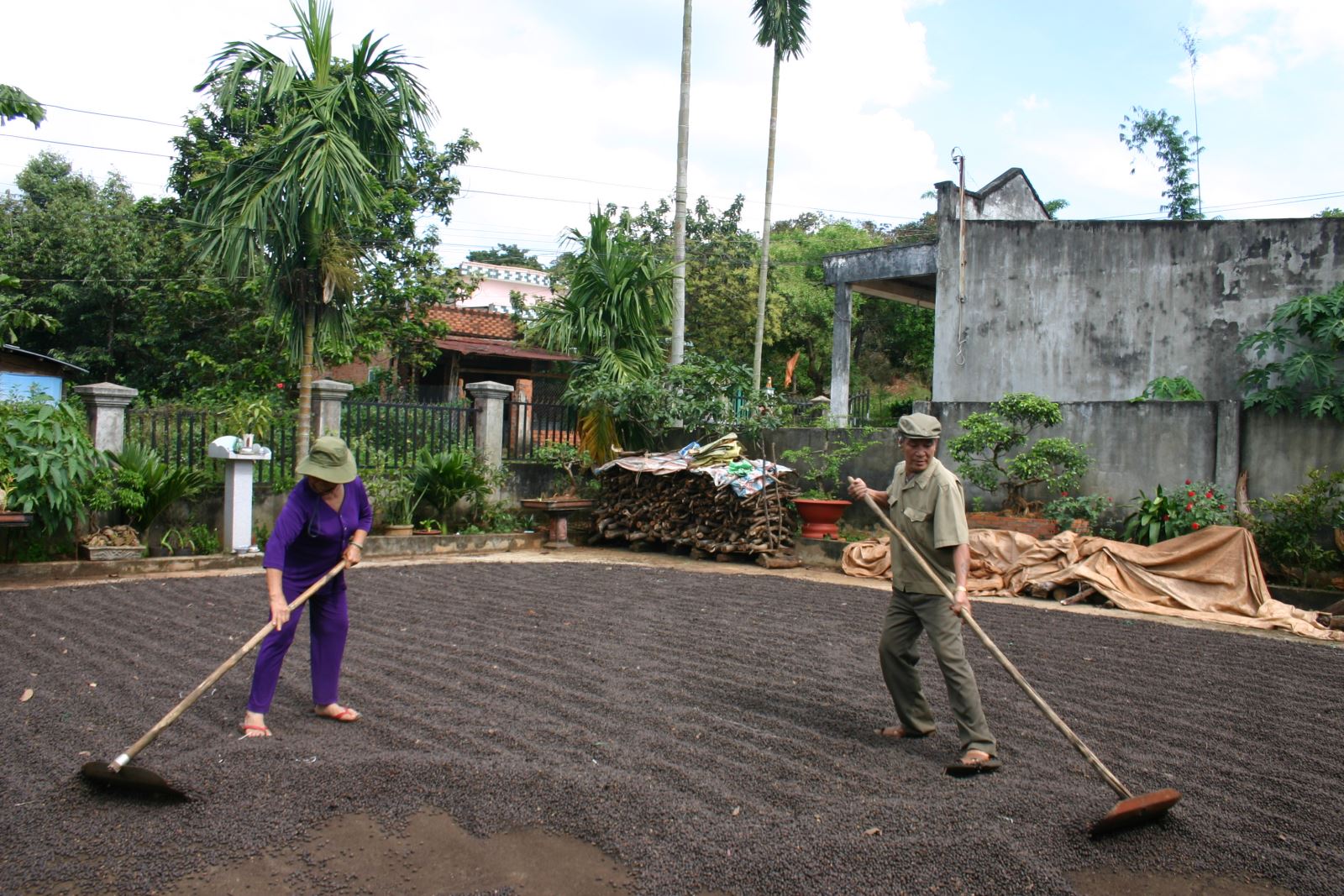 | CCB Trương Xuân Tiêu và vợ Võ Thị Niệm đang phơi cà phê nhà |