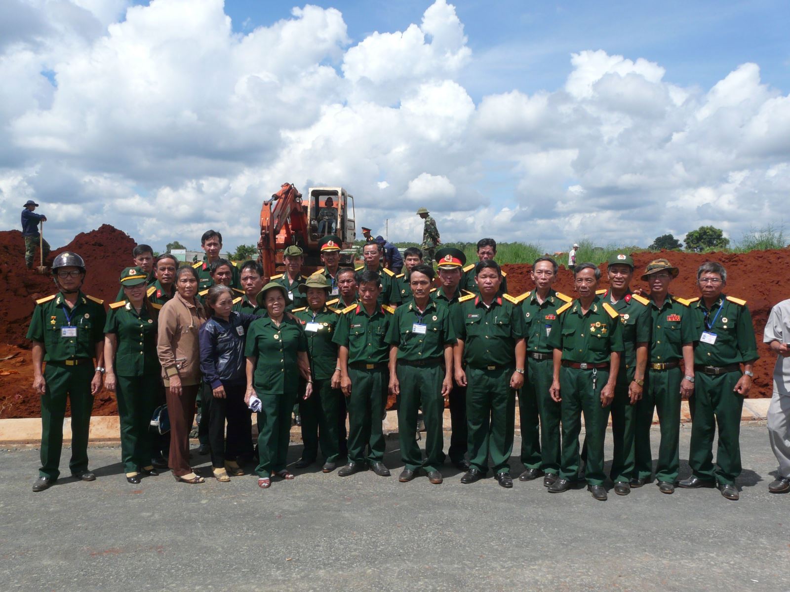 | Đoàn CCB tình nguyện tỉnh cùng các cán bộ, chiến sỹ Đội K72 tại hiện trường khai quật tìm kiếm hài cốt liệt sỹ. Ông Tiêu (người đứng thứ 3 từ phải qua); bà Niệm (người đứng thứ 6 từ trái qua) |