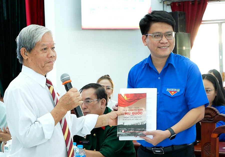 Ông Nguyễn Minh Hoàng trao tặng quyển sách "Trại giam tù binh Phú Quốc, thời kỳ chống thực dân Pháp và đế quốc Mỹ xâm lược", do Ban liên lạc tù binh Việt Nam biên soạn đến đại diện thế hệ trẻ Quận 5.