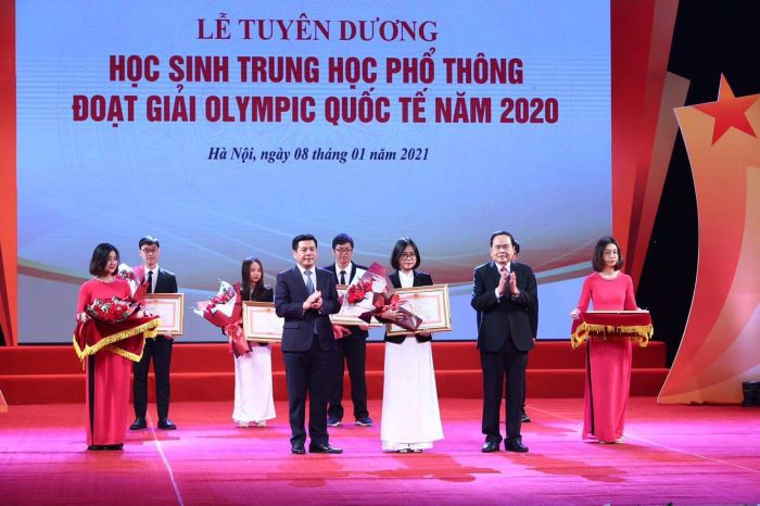 Ông Nguyễn Hồng Diên - Phó trưởng Ban Tuyên giáo Trung ương và ông Trần Thanh Mẫn - Chủ tịch Ủy ban Trung ương MTTQ Việt Nam trao tặng Bằng khen của Thủ tướng Chính phủ cho các học sinh THPT đoạt giải Olympic quốc tế năm 2020