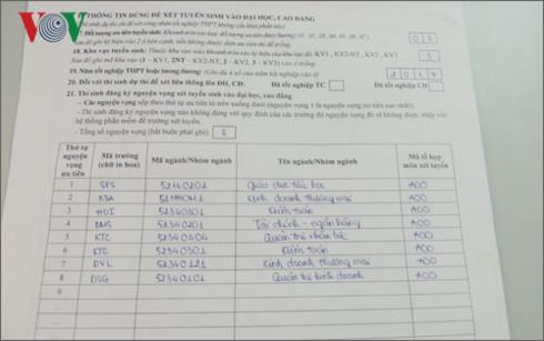 Sợ vuột mất cơ hội trúng tuyển đại học năm nay, một học sinh tại quận 10 đã quyết định đăng ký đến 16 nguyện vọng vào nhiều ngành, nhiều trường đại học khác nhau. Bên cạnh những trường đại học và ngành đào tạo thực sự yêu thích, nam sinh này còn làm đầy bảng đăng ký bằng những nguyện vọng dễ trúng tuyển mà không hề xét đến sở thích hay năng lực bản thân.