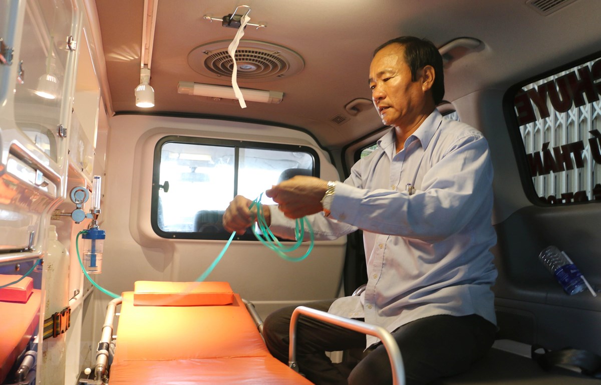 | Ông Ngô Văn Đậu đang kiểm tra lại các thiết bị hỗ trợ cấp cứu trên xe chuyển viện do ông và gia đình mua trị giá 700 triệu đồng để vận chuyển bệnh nhân miễn phí. (Ảnh: Công Mạo/TTXVN) |