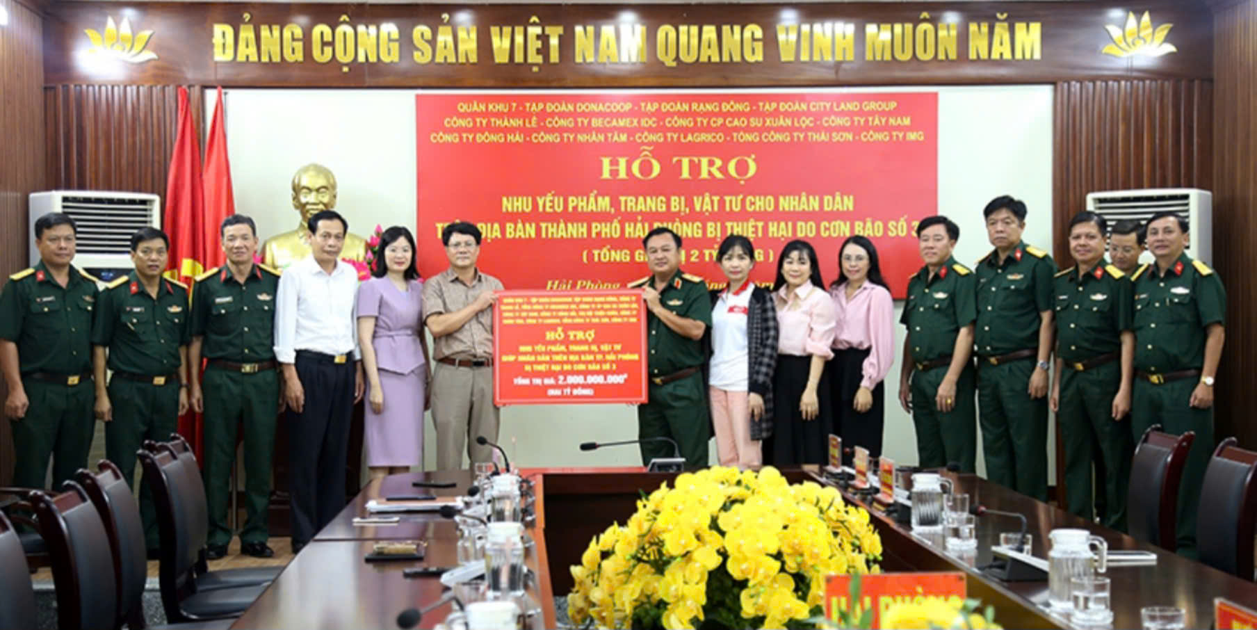 Đoàn Quân Khu 7 gồm: Tập đoàn Donacoop; Tập đoàn Rạng Đông, Công ty Thanh Lễ; Tổng Công ty Becammex IDC; Công ty Cổ phần Cao su Xuân Lộc; Công ty Tây Nam; Công ty Đông Hả; Công ty Nhân Tâm; Công ty Lagrico; Tổng Công ty Thái Sơn; Công ty IMG đã hỗ trợ nhu yếu phẩm, trang thiết bị, vật tư với tổng giá trị 02 tỷ đồng giúp Đảng bộ, chính quyền và nhân dân Hải Phòng khắc phục thiệt hại do bão số 3 gây ra.