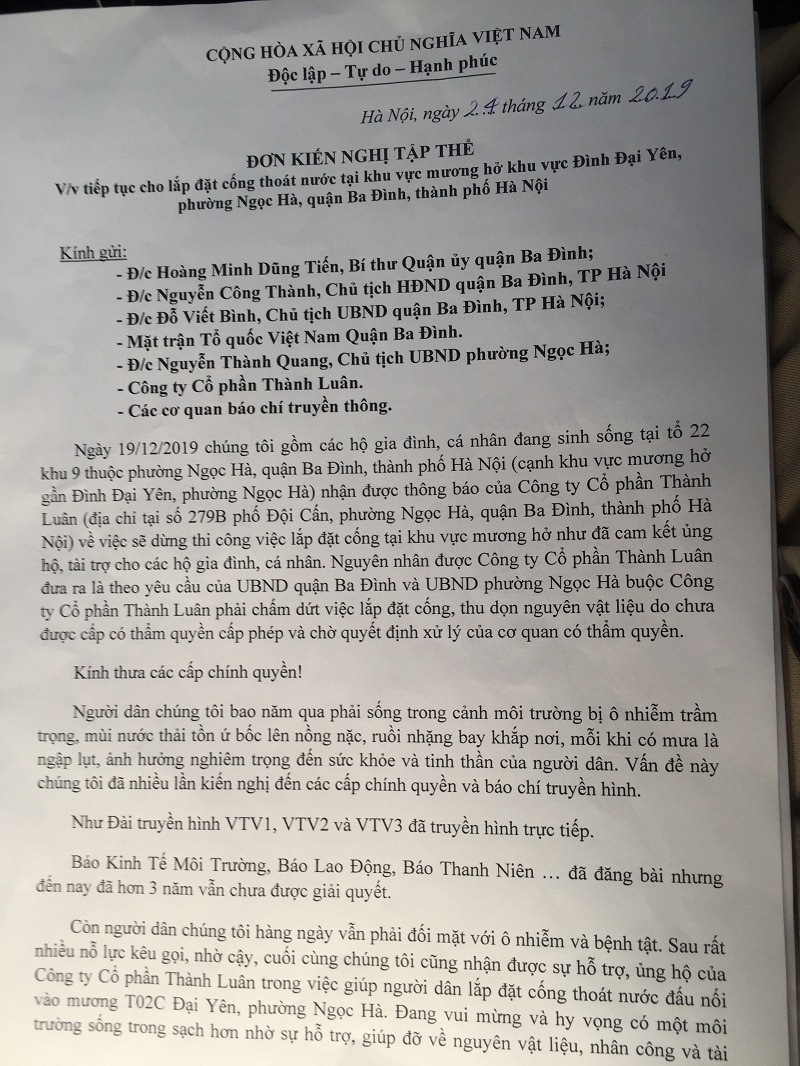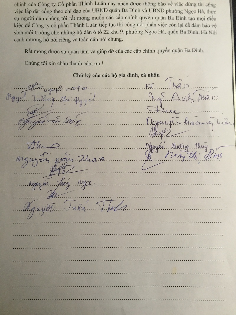“ …Đang vui mừng và hy vọng có một môi trường sống trong sạch hơn nhờ sự hỗ trợ, giúp đỡ về nguyên liệu, nhân công và tài chính của Công Ty Cổ phần Thành Luân nay nhận được thông báo về việc dừng thi công việc lắp đặt cống theo chỉ đạo của UBND quận Ba Đình và UBND phường Ngọc Hà…”