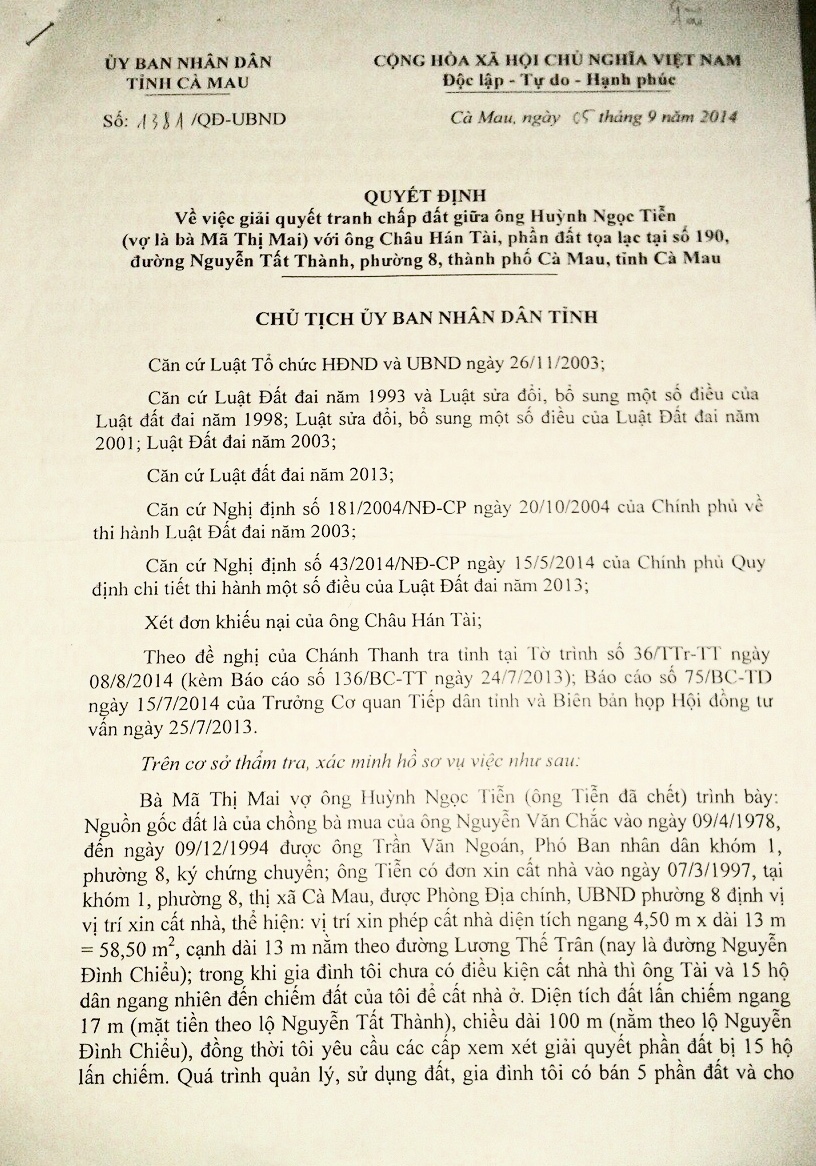 Sau khi báo chí thông tin về vụ việc, UBND tỉnh Cà Mau đã giao cơ quan chức năng kiểm tra, rà soát lại vụ việc theo quy định pháp luật. Ngày 5/9/2014, UBND tỉnh Cà Mau ban hành Quyết định số 1381/QĐ-UBND về giải quyết tranh chấp giữa ông Huỳnh Ngọc Tiễn (vợ là bà Mã Thị Mai) với ông Châu Hán Tài (vợ là bà Nguyễn Thị Kim Liên) phần đất tọa lạc tại số 190 Nguyễn Tất Thành, phường 8, TP.Cà Mau, tỉnh Cà Mau, có nội dung: Tờ chuyển nhượng đất giữa ông Nguyễn Văn Chắc với ông Huỳnh Ngọc Tiễn lập ngày 9/4/1978, có nhiều điểm sửa chữa và ghi thêm diện tích chuyển nhượng, vị trí tứ cận không rõ ràng, trước khi chuyển nhượng cho ông Tiễn, bà Mai, phần đất này nhiều năm bỏ hoang. Ông Tiễn mua đất năm 1978 cho đến khi ông Tiễn có đơn xin cất nhà vào ngày 7/3/1997, trải qua 19 năm ông Tiễn không quản lý, sử dụng. Lúc ông Tiễn có đơn xin cất nhà thì trên phần đất này, ông Tài đã cất nhà ở từ năm 1990, vào thời điểm này chưa phát sinh tranh chấp.