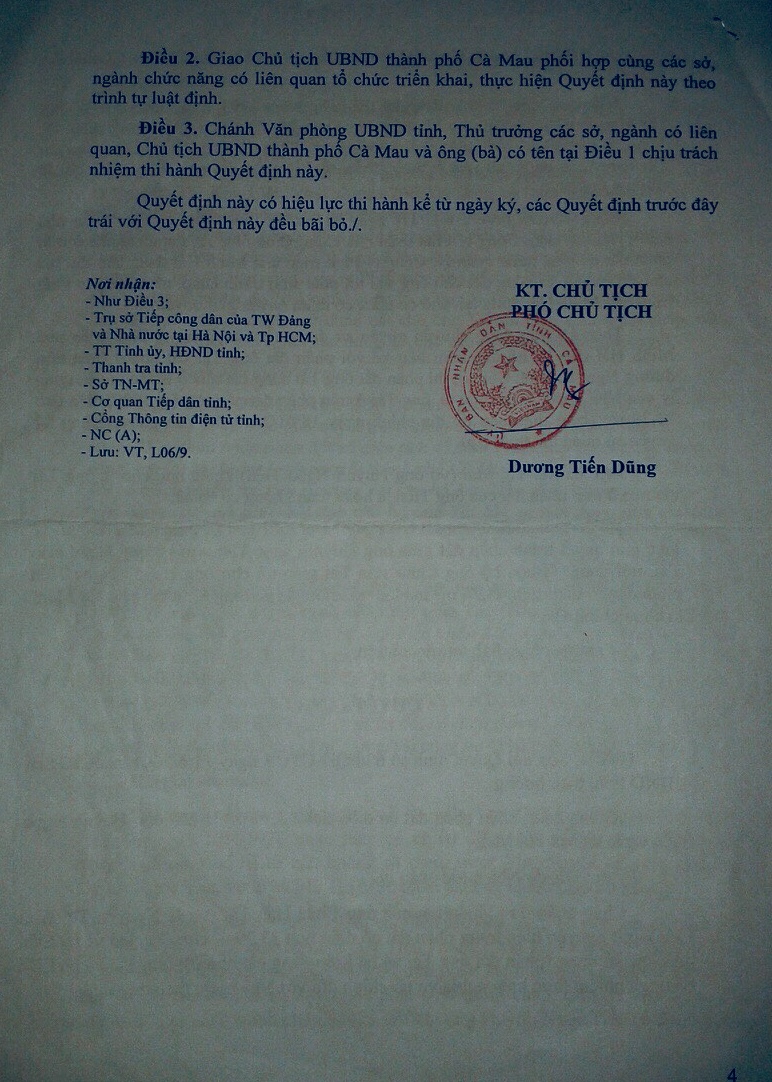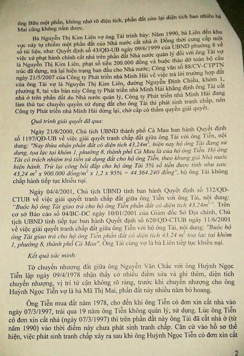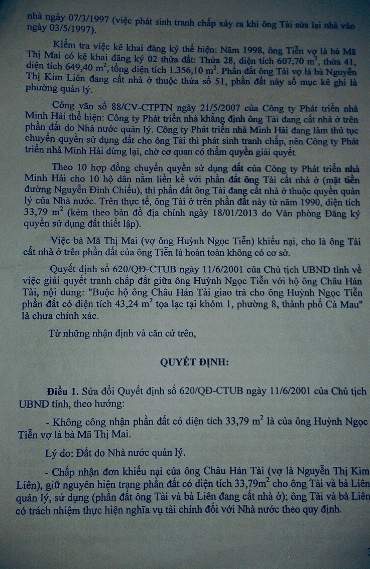 Trong văn bản trên, UBND tỉnh Cà Mau nhận định: Quyết định số 620/QĐ-CT.UB ngày 11/6/2001 của Chủ tịch UBND tỉnh Cà Mau, về việc giải quyết tranh chấp đất giữa ông Huỳnh Ngọc Tiễn với ông Châu Hán Tài, đã buộc hộ ông Tài giao trả cho ông Tiễn phần đất có diện tích 43,24m2 tọa lạc tại khóm 8, phường 8, TP.Cà Mau, là chưa chính xác. Từ những nhận định và căn cứ trên, UBND tỉnh Cà Mau ban hành quyết định số 1381/QĐ-UBND do Phó Chủ tịch UBND tỉnh Cà Mau Dương Tiến Dũng ký, có nội dung: Không công nhận phần đất có diện tích 33,79m2 là của ông Tiễn, bà Mai, lý do đất Nhà nước quản lý. Chấp nhận đơn KN của ông Châu Hán Tài (vợ là Nguyễn Thị Kim Liên), giữ nguyên hiện trạng phần đất có diện tích 33,79m2 cho ông Tài, bà Liên quản lý, sử dụng (phần đất này ông Tài, bà Liên đang ở). Ông Tài, bà Liên có trách nhiệm thực hiện nghĩa vụ tài chính đối với Nhà nước theo quy định. Ngay khi nhận được Quyết định số 1381/QĐ-UBND của UBND tỉnh Cà Mau, bà Nguyễn Thị Kim Liên cho biết, hiện trạng phần đất gia đình bà đã xây dựng nhà ở, diện tích là 45,14m2 nhưng trong Quyết định 1381/QĐ-UBND của tỉnh Cà Mau chỉ công nhận cho gia đình bà quản lý, sử dụng diện tích....33,79m2 (còn thiếu tới 9,45m2) là chưa phù hợp với thực tế, gây thiệt hại đến quyền và lợi ích hợp pháp của gia đình bà. Theo Quyết định trên thì chiều ngang của căn nhà từ 3,75m, nay chỉ còn 2,75m là điều rất vô lý và phần đất bị thiếu để làm gì, giao cho ai không được đề cập tới!?