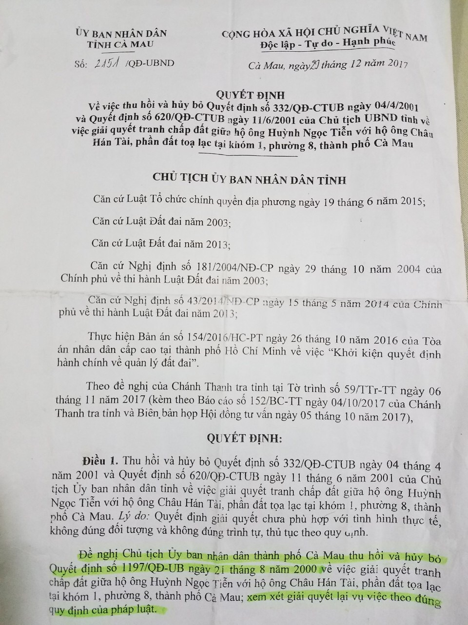 Sau khi xem xét lại quá trình giải quyết vụ việc, ngày 29/12/2017, UBND tỉnh Cà Mau đã ban hành quyết định số 2151/QĐ-UBND thu hồi, hủy bỏ quyết định số 332/QĐ-CT.UB ngày 4/4/2001 và Quyết định số 620/QĐ-CT.UB ngày 11/6/2001 của Chủ tịch UBND tỉnh Cà Mau, về việc giải quyết tranh chấp đất giữa hộ ông Huỳnh Ngọc Tiễn với hộ ông Châu Hán Tài, phần đất tọa lạc tại khóm 8, phường 8, thành phố Cà Mau. Lý do quyết định giải quyết chưa phù hợp với tình hình thực tế, không đúng đối tượng và không đúng trình tự, thủ tục theo quy định pháp luật. Đề nghị Chủ tịch UBND TP.Cà Mau thu hồi, hủy bỏ Quyết định số 1197/QĐ-UBND ngày 21/8/2000 về việc giải quyết tranh chấp đất giữa hộ ông Tiễn và hộ ông Tài, phần đất tọa lạc tại khóm 8, phường 8, TP. Cà Mau, xem xét lại vụ việc theo đúng quy định pháp luật. Chính câu thòng “xem xét lại vụ việc theo quy định pháp luật” mà đến nay hộ ông Châu Hán Tài, gặp nhiều khó khăn trong việc làm hồ sơ xin cấp Giấy chứng nhận quyền sử dụng đất, quyền sở hữu nhà, trong khi các hộ xung quanh đều được cấp giấy chủ quyền nhà đất- trừ ông Tài, bà Liên. Hơn nữa, bà Mã Thị Mai (vợ ông Tiễn) đã bán nhà đất và chuyển đi sinh sống ở nơi khác từ lâu, không có căn cứ để tranh chấp với gia đình ông Tài. Nếu KN, khiếu kiện Quyết định của UBND tỉnh Cà Mau và UBND TP.Cà Mau thì đã hết thời hiệu. Người chủ mới mua nhà của bà Mai đang tiến hành xây dựng công trình 3 tầng lầu, làm căn nhà bà Liên bị nứt tường, sụt lún, ngập nước, có nguy cơ bị đổ sập bất cứ lúc nào, đe dọa sức khỏe, tính mạng và tài sản. Vì vậy, chỉ ban ngày thì gia đình bà Liên ở lại, còn ban đêm phải đi lánh nạn, trong khi xin hồ sơ xin cấp chủ quyền nhà, đất bị... vướng do hiểu không đầy đủ, không đúng quyết định của UBND tỉnh Cà Mau, đã ảnh hưởng đến quyền và lợi ích hợp pháp của gia đình bà Liên, gây bức xúc trong dư luận.