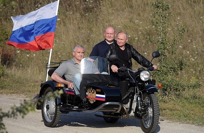 Trong sự kiện này, ông Putin đã “cưỡi” một chiếc xe mô tô có cắm lá cờ Nga dẫn đầu đoàn diễu hành. Trên xe có lãnh đạo Crimea Sergei Aksenov và Thống đốc lâm thời Sevastopol Mikhail Razvozhaev.