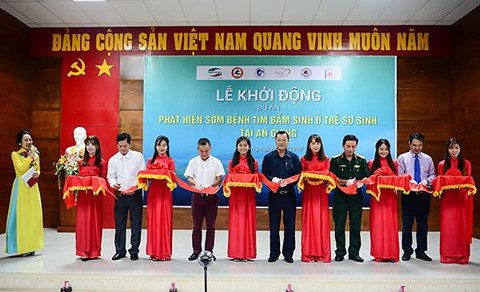| Các đơn vị tham gia cắt băng khởi động dự án “Phát hiện sớm bệnh tim bẩm sinh ở trẻ sơ sinh tại An Giang”. |