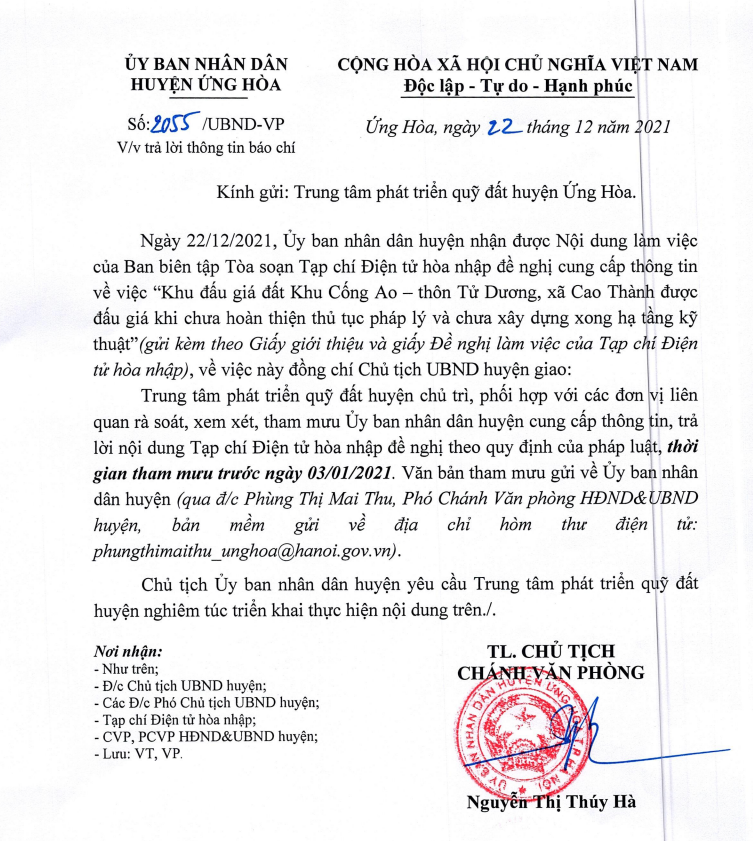 Ngay sau khi tiếp nhận thông tin phản ánh, Tạp chí điện tử Hoà nhập có văn bản gửi tới UBND huyện Ứng Hoà, đến ngày 22/12/2021 UBND huyện Ứng Hòa đã có văn bản số 2055/UBND-VP về việc trả lời thông tin báo chí gửi Trung tâm phát triển quỹ đất với nội dung: “Trung tâm phát triển quỹ đất huyện chủ trì, phối hợp với các đơn vị liên quan rà soát, xem xét, tham mưu UBND huyện cung cấp thông tin, trả lời nội dung tạp chí Điện tử Hoà Nhập đề nghị theo quy định của pháp luật”. Theo đó thời gian trả lời trước ngày 3/1/2022.