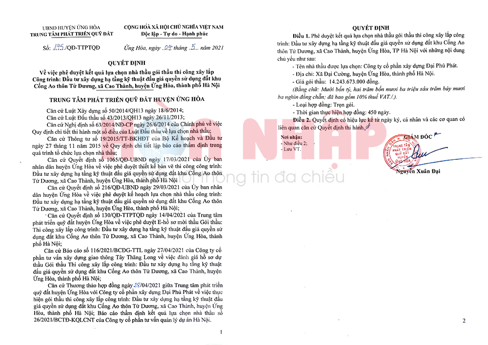 Theo nội dung đơn phản ánh, ngày 14/04/2021, ông Nguyễn Xuân Đại - Giám đốc trung tâm phát triển quỹ đất huyện Ứng Hòa - ký quyết định số 130/QĐ-TTPTQĐ về việc phê duyệt hồ sơ mời thầu gói thầu thi công xây lắp của công trình: Đầu tư xây dựng HTKT đấu giá QSĐ khu Cống Ao, thôn Tử Dương, xã Cao Thành.