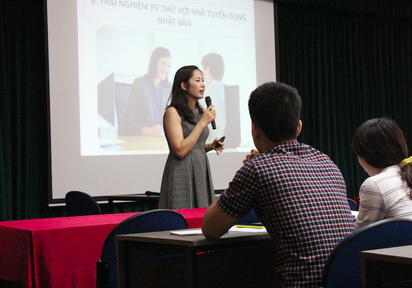 | Tại buổi hội thảo các bạn sinh viên đã được lắng nghe những chia sẻ đến từ CEO VIJA Link - Trần Thị Khanh về những thông tin tuyển dụng, môi trường làm việc, văn hoá Nhật Bản... đống thời trực tiếp hướng dẫn cách viết CV và tư vấn phỏng vấn. |