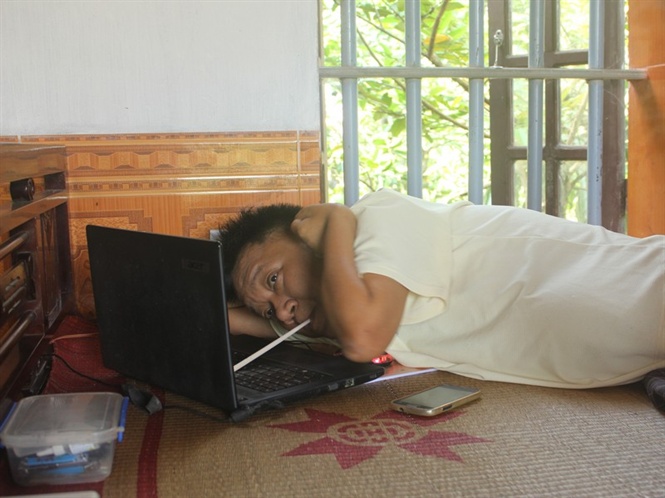 | Anh Giang dùng miệng ngậm đũa để gõ bàn phím máy tính |