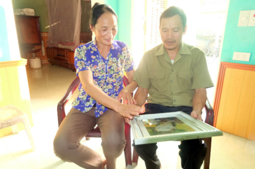 | Bà Vũ Thị Dụ (mẹ Nga) và ông Nguyễn Văn Xuân (bố Nga) ngồi bên di ảnh của Nguyễn Thị Nga thuật lại câu chuyện hiến giác mạc của đứa con gái mình |