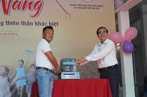 | Trưởng ban từ thiện CEO K35, ông Nguyễn Nhật Phương trao tặng máy điều trị âm thanh cho Trung tâm |