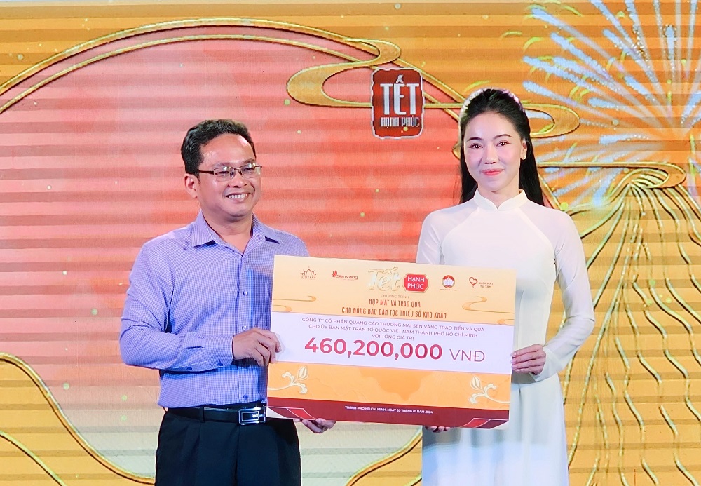 Thạc sĩ Phạm Kim Dung - Tổng giám đốc Công ty Sen Vàng, Chủ tịch Câu lạc bộ Suối mát Từ Tâm (phía phải) trao bảng tượng trưng phần hỗ trợ trị giá hơn 460 triệu đồng đến Ủy ban MTTQ Việt Nam TP Hồ Chí Minh.