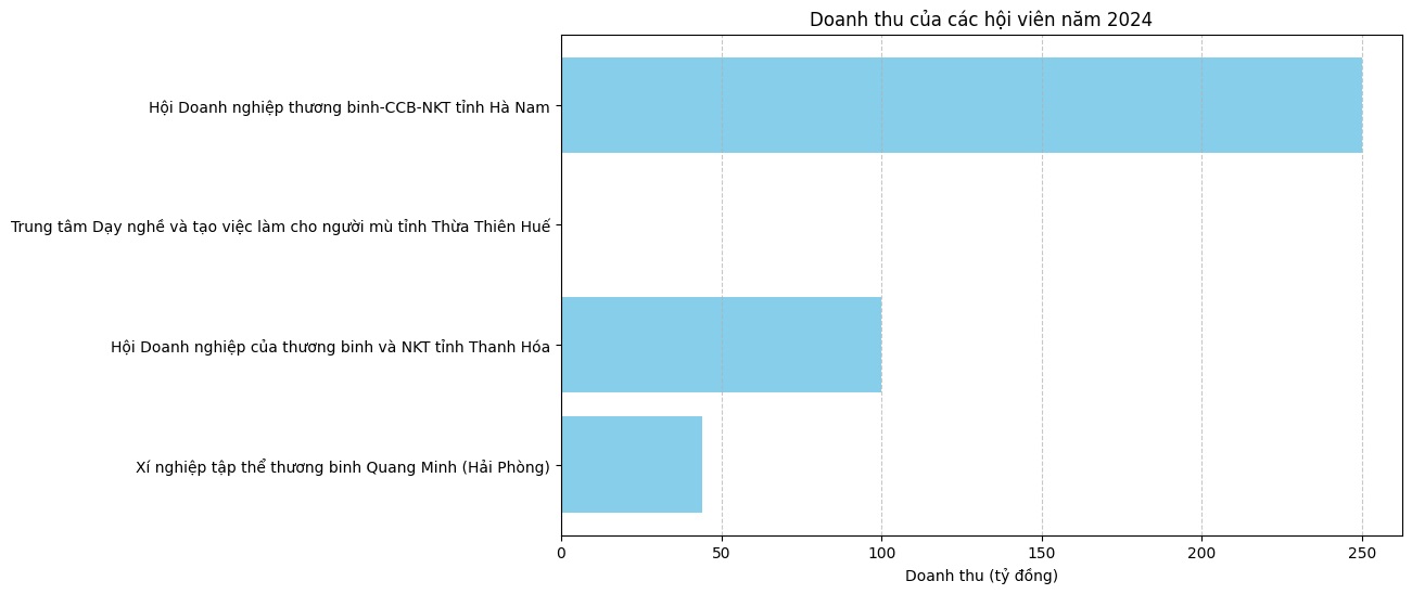 Năm 2024, mặc dù kinh tế suy thoái, các đơn vị hội viên Hiệp hội đã nỗ lực duy trì và đạt được những thành tựu đáng khích lệ. Xí nghiệp Tập thể Thương binh Quang Minh (Hải Phòng) đạt doanh thu 44 tỷ đồng, đóng góp ngân sách 650 triệu đồng và tích cực tham gia hoạt động từ thiện với số tiền 200 triệu đồng. Công ty Cổ phần Đầu tư Bất động sản Sao Đỏ tập trung kinh doanh cho thuê kho bãi, nội thất ô tô và bảo vệ công trình. Hội Doanh nghiệp Thương binh và Người khuyết tật tỉnh Thanh Hóa đã tạo việc làm cho gần 2.000 lao động với doanh thu ấn tượng từ các đơn vị thành viên, như Công ty Dược Ánh Dương đạt 30 tỷ đồng, HTX Tân Thọ đạt 9 tỷ đồng và Công ty Thương binh 27/7 Chiến Thắng đạt 5 tỷ đồng. Trung tâm Dạy nghề và Việc làm cho Người mù Thừa Thiên Huế tổ chức thành công 3 khóa đào tạo nghề, xuất khẩu sản phẩm thủ công và đạt doanh thu 451 triệu đồng. Tạp chí Điện tử Hòa Nhập đã đẩy mạnh công tác thiện nguyện, hỗ trợ thương bệnh binh và người khuyết tật, đồng thời kiện toàn cơ cấu tổ chức. Hội Doanh nghiệp Thương binh-CCB-NKT tỉnh Hà Nam đóng góp 24 tỷ đồng ngân sách nhà nước từ tổng doanh thu 250 tỷ đồng và hoàn thành xuất sắc các chỉ tiêu sản xuất kinh doanh, góp phần phát triển kinh tế địa phương. Nhìn chung, các đơn vị hội viên đã vượt qua khó khăn, phát triển sản xuất kinh doanh, nâng cao chất lượng cuộc sống cho hội viên và đóng góp tích cực vào an sinh xã hội cũng như kinh tế địa phương.