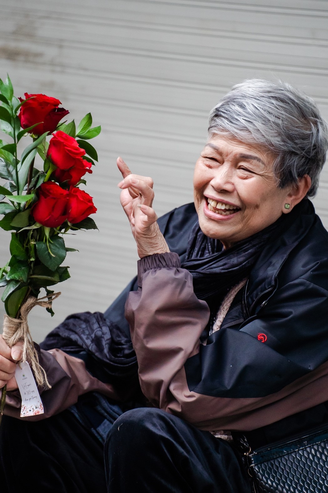 Cụ Nguyễn Thị Tuyết, 85 tuổi, nhận hoa không dấu được xúc động “ông mất đã 6 năm rồi, từ ngày ông mất bà không còn ai được tặng hoa nữa. Bà cũng chẳng biết ngày lễ tình yêu là gì đâu, nhưng đoá hoa này bà sẽ mang về để tặng ông”.
