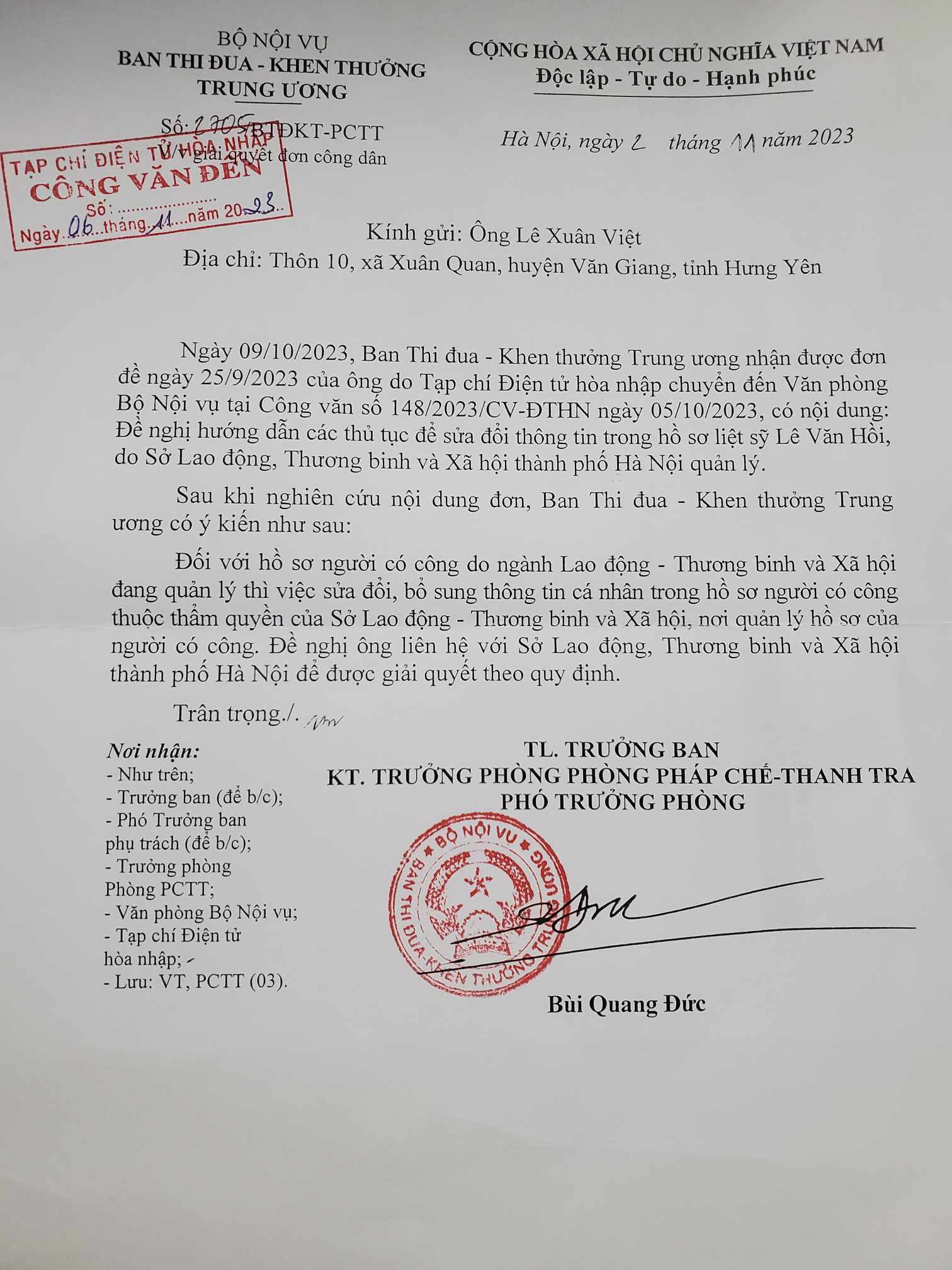 Sau đó, ngày 06/11/2023, Tạp chí điện tử Hòa nhập có nhận được Văn bản số 2705/BTĐKT-PCTT ngày 02/11/2023 (V/v giải quyết đơn công dân) của Ban Thi đua – khen thưởng Trung ương (Bộ Nội vụ) do Phó trưởng phòng KT. Trưởng phòng Pháp chế - Thanh tra Bùi Quang Đức ký, đóng dấu.