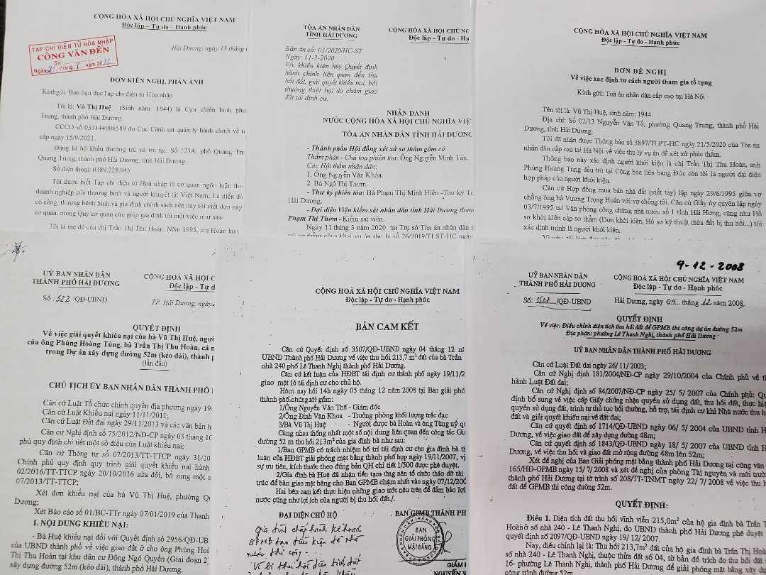 Trong Đơn kiến nghị, phản ánh cựu chiến binh (CCB) Vũ Thị Huệ viết: “Tôi là mẹ đẻ của chị Trần Thị Thu Hoàn. Năm 1995, chị Hoàn làm việc tại Đức đã rủ một người bạn cùng làm ăn là anh Tùng (Thời điểm đó cũng sinh sống và lao động tại Đức) chung tiền để mua đất. Anh Tùng, chị Hoàn đã gửi cho tôi số tiền tính theo vàng 9999 là 91 lượng để nhờ tôi đứng ra giao dịch nhận chuyển nhượng quyền sử dụng đất và quyền sở hữu nhà ở đối với bất động sản có địa chỉ số 45B Thống Nhất, phường Trần Phú, thị xã Hải Dương (Sau đổi thành số 240 Lê Thanh Nghị, phường Lê Thanh Nghị, thành phố Hải Dương, tỉnh Hải Dương).