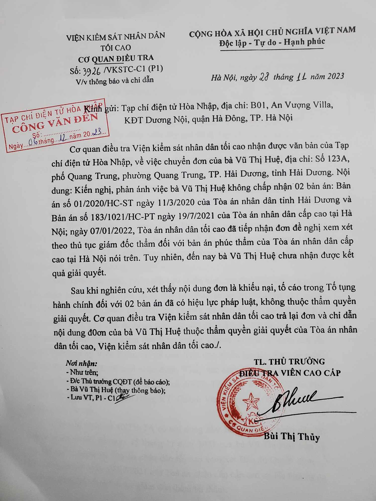 Văn bản số: 3926/VKSTC-C1 (P1) có nội dung như sau: “Cơ quan điều tra Viện Kiểm sát nhân dân tối cao nhận được văn bản của Tạp chí điện tử Hòa Nhập, về việc chuyển đơn của bà Vũ Thị Huệ, địa chỉ: Số 123A, phố Quang Trung, phường Quang Trung, thành phố Hải Dương, tỉnh Hải Dương. Nội dung: Kiến nghị, phản ánh việc bà Vũ Thị Huệ không chấp nhận 02 bản án: Bản án số 01/2020/HC-ST ngày 11/3/2020 của Toà án nhân dân tỉnh Hải Dương và Bản án số 183/2021/HCPT ngày 19/07/2021 của Toà án nhân dân cấp cao tại Hà Nội; ngày 07/01/2022, Tòa án nhân dân tối cao đã tiếp nhận đơn đề nghị xem xét theo thủ tục giám đốc thẩm đối với Bản án Phúc thẩm của Toà án nhân dân cấp cao tại Hà Nội nói trên. Tuy nhiên đến nay bà Vũ Thị Huệ chưa nhận được kết quả giải quyết.