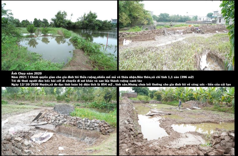 Năm 2016. Chính quyền xã đã cho địa chính xã là ông Nhân, ông Dũng thuê đội đo đạc về đo đạc trộm diện tích đất nhà tôi, để vẽ bản đồ mới và ông Hùng Chủ tịch xã đã cố tình bắt gia đình tôi phải nhận diện tích mới đo (2016) thì mới cắm mốc bờ ao và 0,75 sào ruộng vẫn không giải quyết cho gia đình tôi.