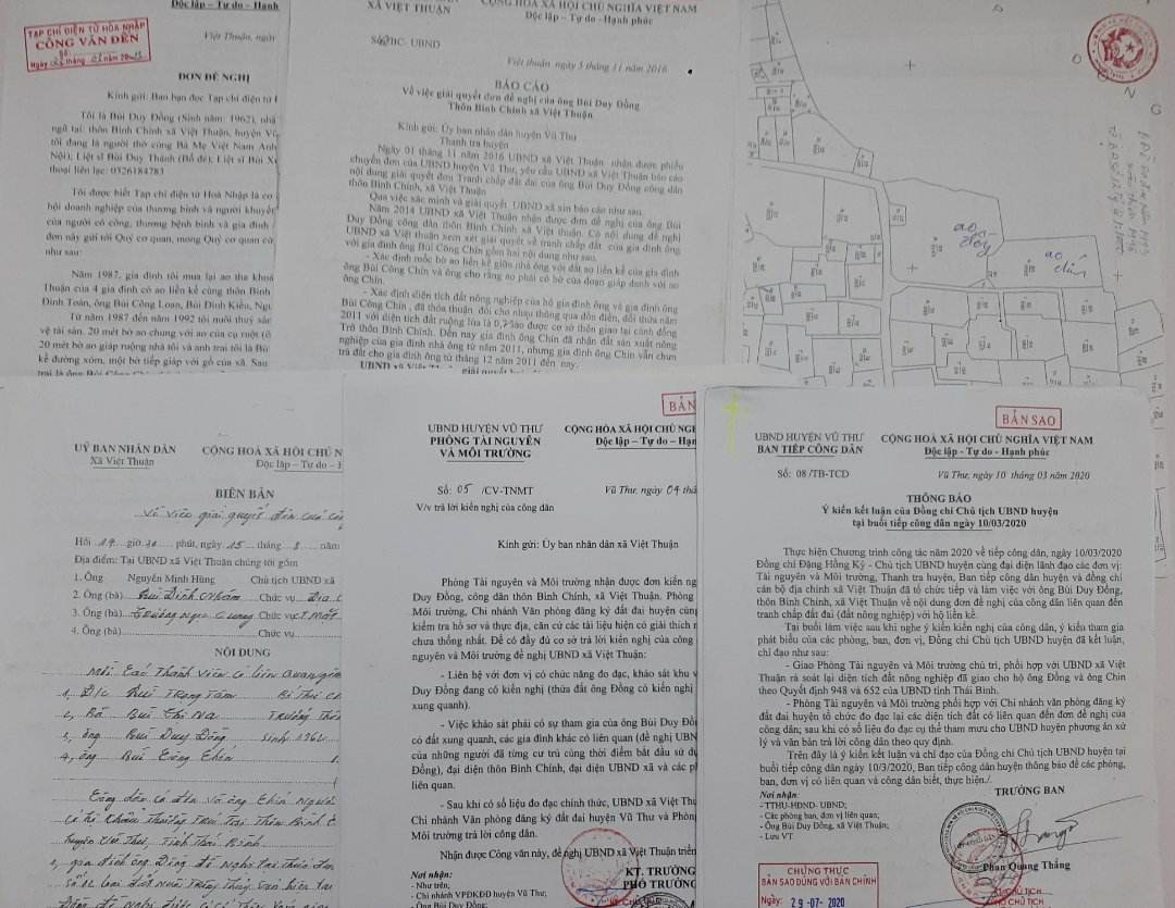 Trước tình trạng trên, ngày 15/11/2021, tôi tiếp tục làm đơn xin đề nghị gửi tới UBND tỉnh Thái Bình. Sau đó, ngày 06/12/2021, TL Chủ tịch UBND tỉnh Phó Chánh Văn phòng Nguyễn Duy Chinh đã ký Văn bản số 5366/UBND-BTCD chuyển đơn của tôi cho UBND huyện Vũ Thư. Đồng thời ngày 18/10/2022, Phó Ban Tiếp công dân tỉnh Phạm Như Trỗi cũng có văn bản số 261/BTCD V/v giải quyết đơn của ông Bùi Duy Đồng, xã Việt Thuận cho UBND huyện Vũ Thư.